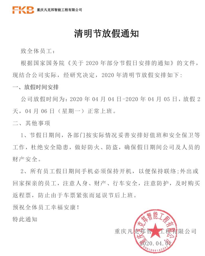 根據(jù)國家國務(wù)院《關(guān)于2020年部分節(jié)假日安排的通知》的文件,現(xiàn)結(jié)合公司實(shí)際,經(jīng)研究決定,2020 年清明節(jié)放假安排如下: