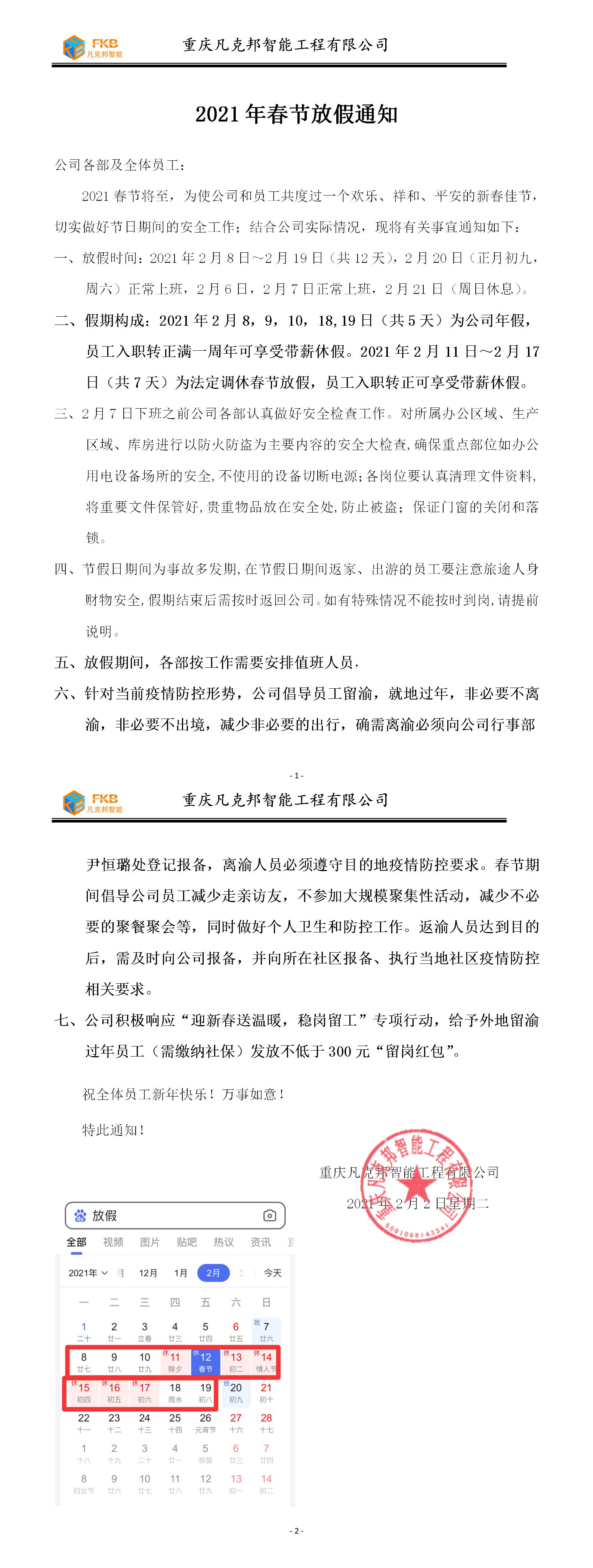 一、放假時(shí)間:2021年2月8日-2月19日(共12天),2月20日(正月初九,周六)正常上班,2月6日、2月7日正常上班,2月21日(周日休息)。